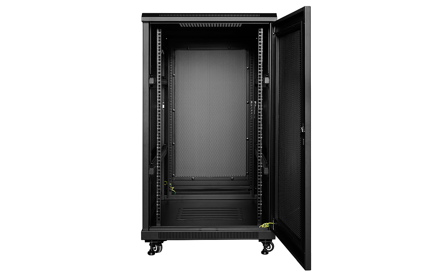 Přední a zadní dveře jsou vyrobeny z vysoce kvalitního perforovaného kovu, což zvyšuje mechanickou odolnost skříně a má pozitivní vliv na cirkulaci vzduchu v jejím vnitřku. Ostatní stěny jsou vyrobeny z práškově lakovaného plechu, díky čemuž je skříň odolná proti korozi, oxidaci a oděru laku. Boční panely lze sejmout (dveře na západku), což umožňuje ještě lepší přístup k zařízením. Lze je také zamknout na klíč, což zvyšuje bezpečnost zařízení namontovaných ve skříni. Zadní dveře lze také zamykat na klíč. Stojící skříň RACK byla navržena tak, aby bylo možné namontovat dveře na levou nebo pravou stranu. Skříň nabízí různé možnosti vedení kabelů (nahoře, dole).