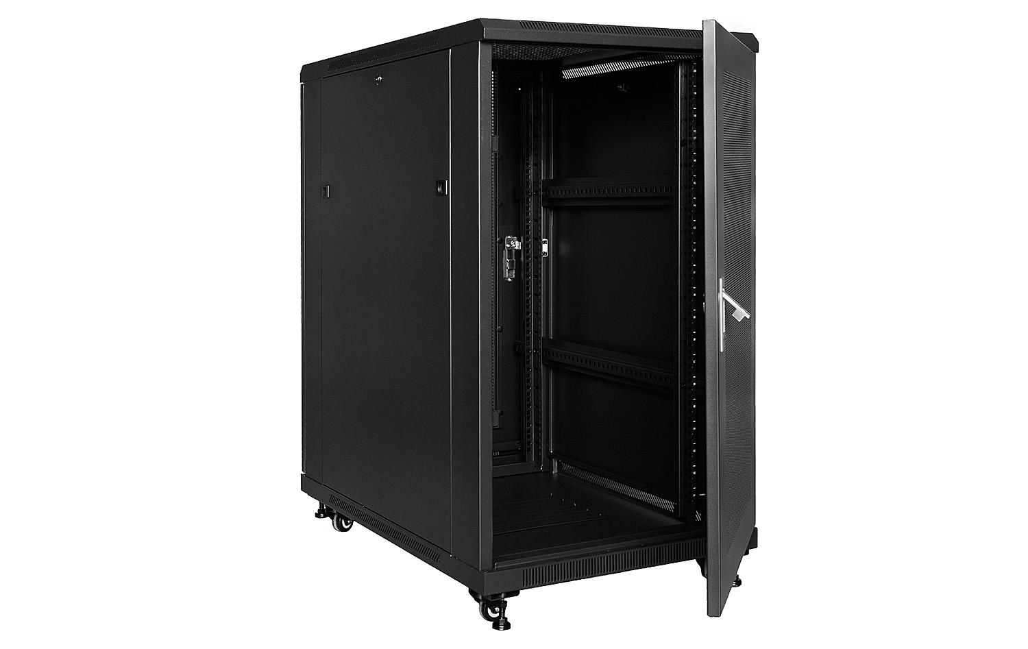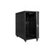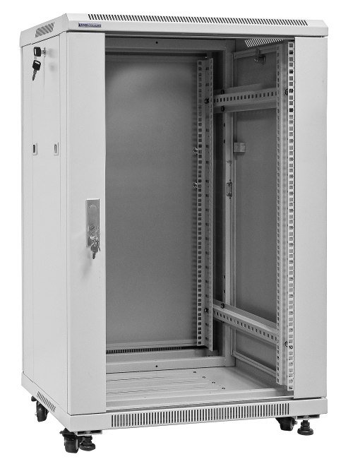 Přední a zadní dveře jsou vyrobeny z vysoce kvalitního perforovaného kovu, což zvyšuje mechanickou odolnost skříně a má pozitivní vliv na cirkulaci vzduchu v jejím vnitřku. Ostatní stěny jsou vyrobeny z práškově lakovaného plechu, díky čemuž je skříň odolná proti korozi, oxidaci a oděru laku. Boční panely lze sejmout (dveře na západku), což umožňuje ještě lepší přístup k zařízením. Lze je také zamknout na klíč, což zvyšuje bezpečnost zařízení namontovaných ve skříni. Zadní dveře lze také zamykat na klíč. Stojící skříň RACK byla navržena tak, aby bylo možné namontovat dveře na levou nebo pravou stranu. Skříň nabízí různé možnosti vedení kabelů (nahoře, dole).