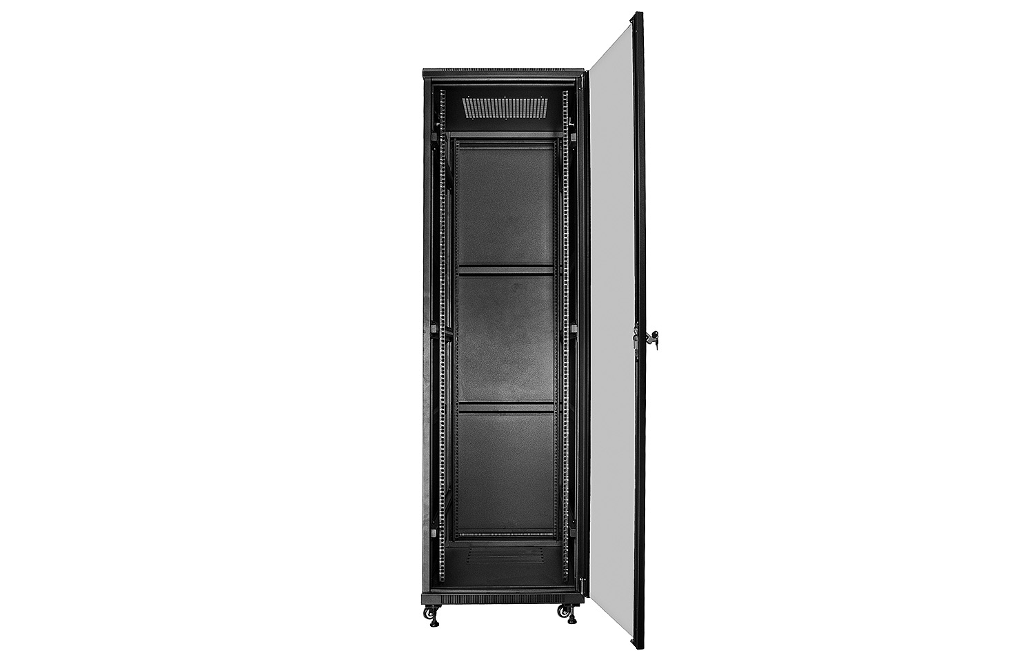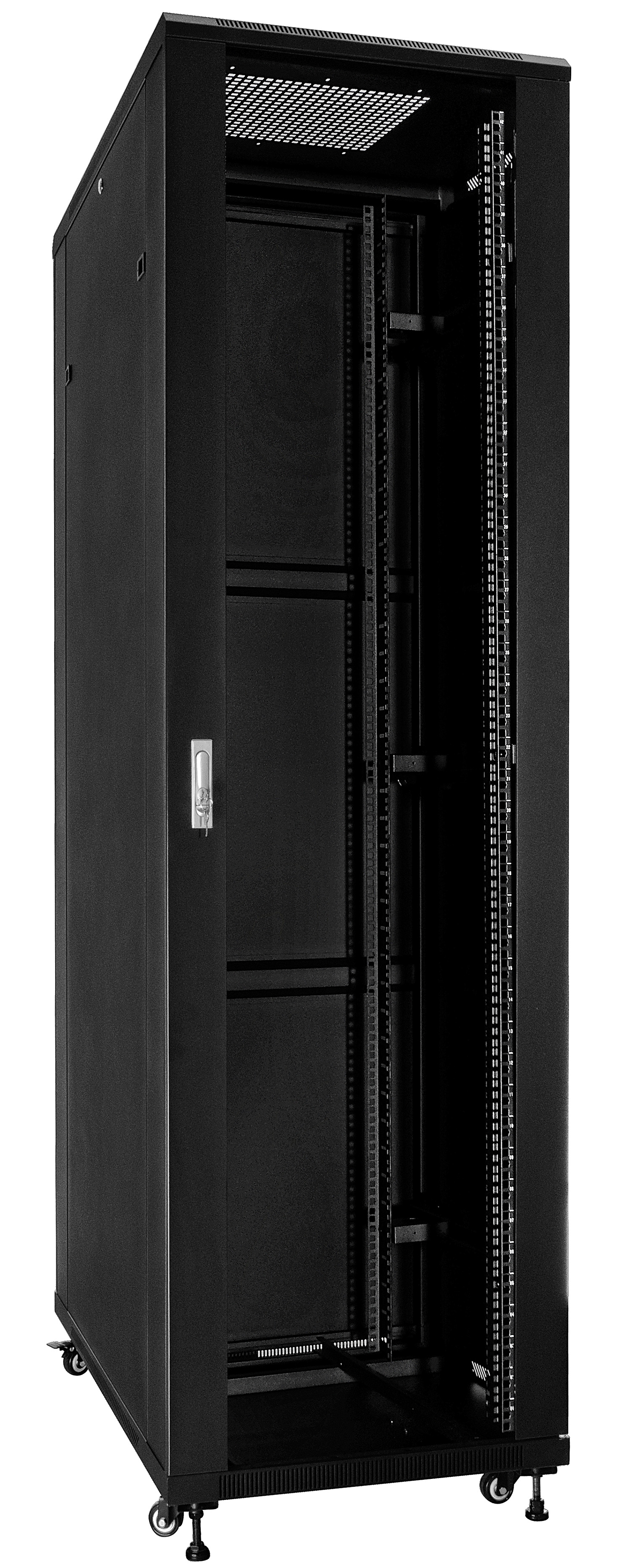 Přední dveře jsou vyrobeny z tvrzeného skla, které zvyšují jeho mechanickou pevnost a tepelnou stabilitu. Zbytek stěn jsou vyrobeny z barevně lakovaného plechu, takže je odolný vůči korozi, oxidaci a odstranění barvy. Boční stěny mohou být odstraněny (zacvakávání), což vznikne ještě větší přístup k zařízení. Mohou být také uzamčeny, což zvyšuje bezpečnost zařízení instalovaných v rozvaděči. Je zde také možnost odemikání a zamikání na klíč zadních dveří. Pojízdná racková skříň je navržen tak, aby dveře bylo možné namontovat vlevo nebo vpravo. Ve skříni existují různé možnosti pro vstup kabelů (nahoře, dole).