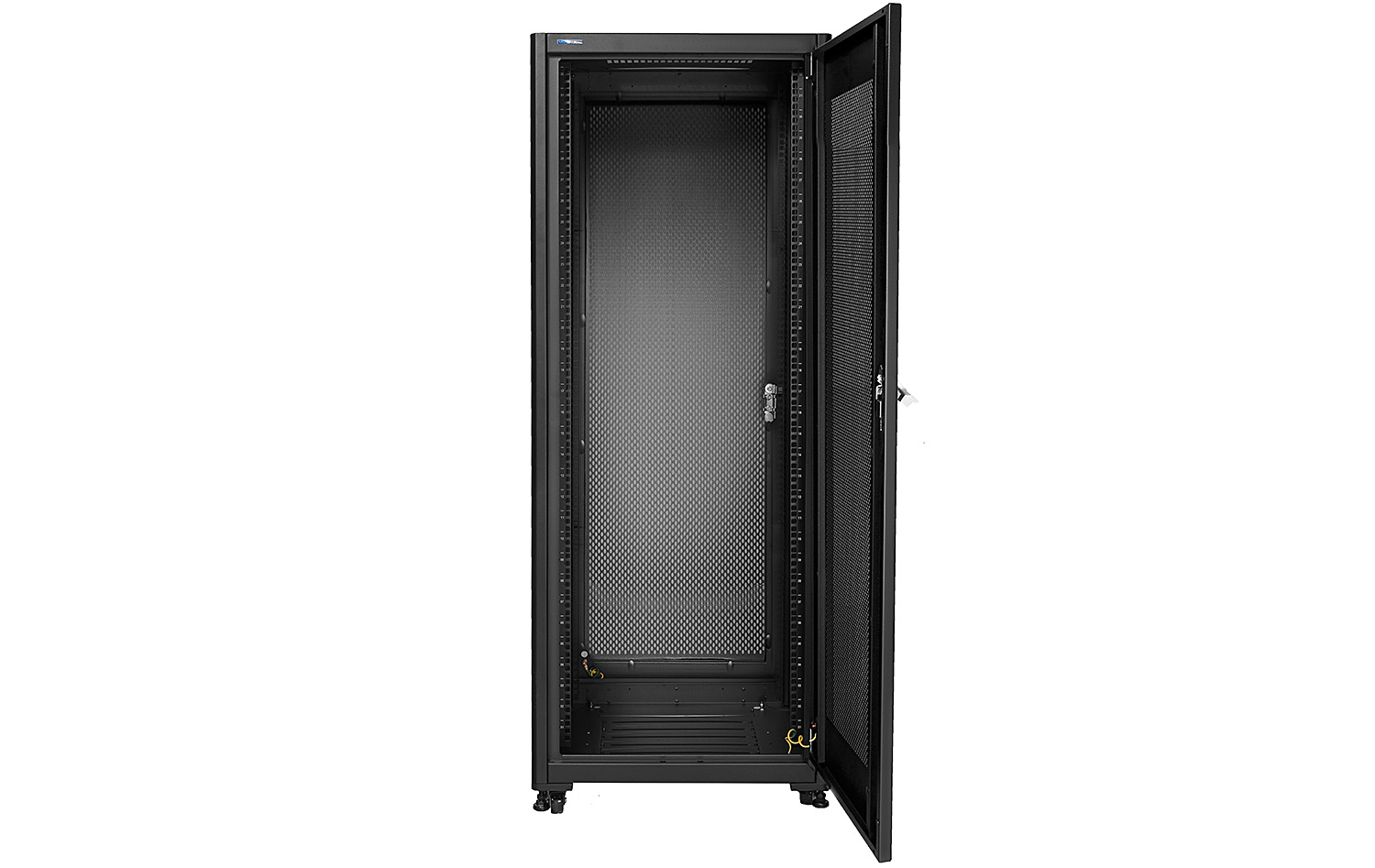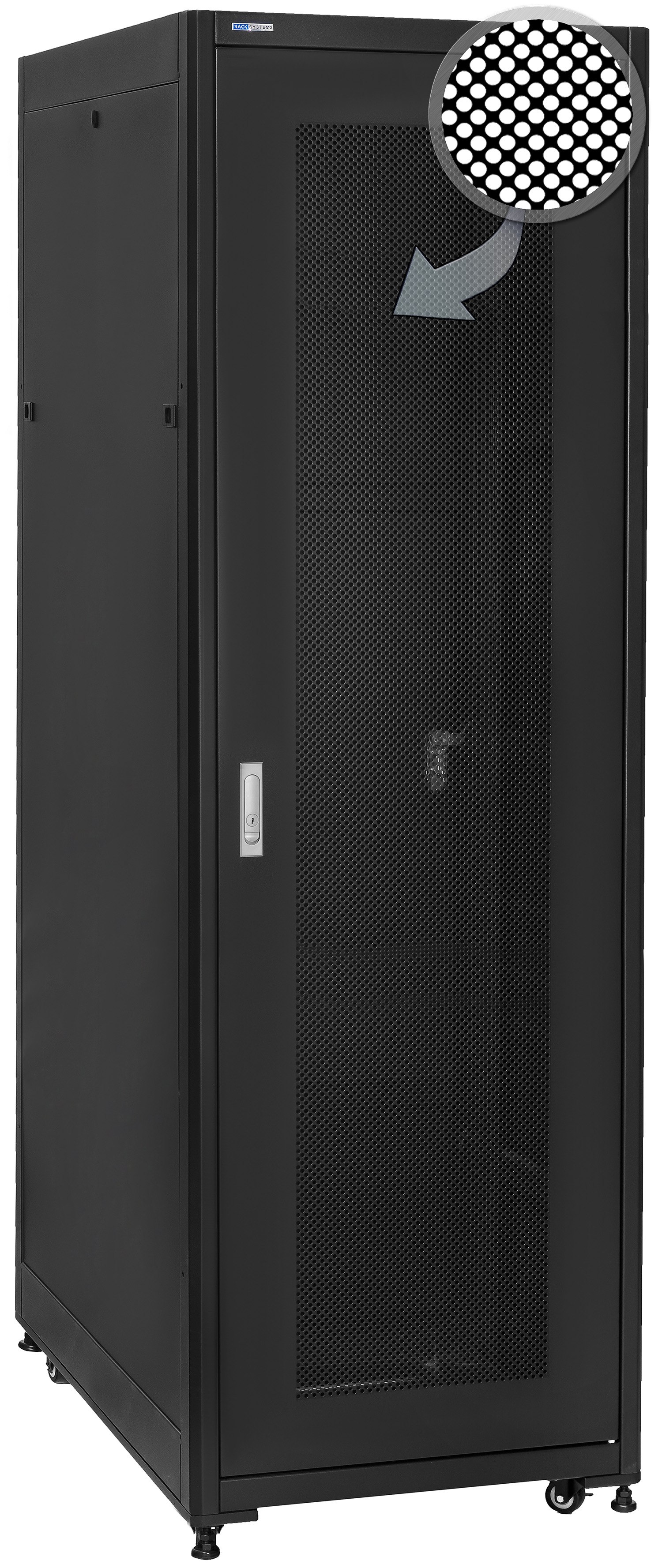 Přední dveře jsou vyrobeny z vysoce kvalitního perforovaného kovu. Perforované dveře zvyšují mechanickou odolnost skříně a mají pozitivní vliv na cirkulaci vzduchu v jejím vnitřku. Ostatní stěny jsou vyrobeny z práškově lakovaného plechu, díky čemuž je skříň odolná proti korozi, oxidaci a oděru laku. Boční panely lze sejmout (dveře na západku), což umožňuje ještě lepší přístup k zařízením. Zadní dveře lze také zamykat na klíč, což zvyšuje bezpečnost zařízení namontovaných ve skříni. Stojící skříň RACK byla navržena tak, aby bylo možné namontovat dveře na levou nebo pravou stranu. Skříň nabízí různé možnosti vedení kabelů (nahoře, dole).