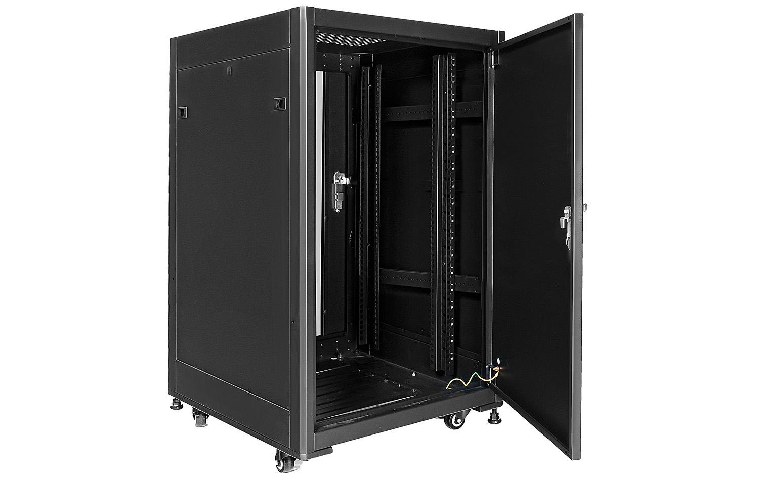 Přední dveře jsou vyrobeny z tvrzeného skla, které zvyšuje jejich mechanickou a tepelnou odolnost. Zbytek stěn je vyroben z práškově lakovaného plechu, který je odolný proti korozi, oxidaci a oděru barvy. Boční panely lze vyjmout, což vám umožní ještě lepší přístup k zařízení. Mohou být také uzamykatelné, což zvyšuje bezpečnost zařízení instalovaných ve skříni. Zadní dveře lze otevírat a zavírat také klíčem. Pojízdná skříň RACK je navržena tak, aby bylo možné dveře namontovat vlevo nebo vpravo. Skříň má různé možnosti vstupu kabelů (nahoře, dole).