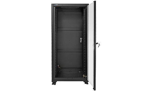 Přední dveře jsou vyrobeny z tvrzeného skla, které zvyšuje jejich mechanickou a tepelnou odolnost. Zbytek stěn je vyroben z práškově lakovaného plechu, který je odolný proti korozi, oxidaci a oděru barvy. Boční panely lze vyjmout, což vám umožní ještě lepší přístup k zařízení. Mohou být také uzamykatelné, což zvyšuje bezpečnost zařízení instalovaných ve skříni. Zadní dveře lze otevírat a zavírat také klíčem. Pojízdná skříň RACK je navržena tak, aby bylo možné dveře namontovat vlevo nebo vpravo. Skříň má různé možnosti vstupu kabelů (nahoře, dole).