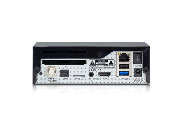 Na zadním panelu je zabudovaný satelitní DVB-S2X tuner, 1x slot pro čtečku karet, 1x slot pro CI modul, 1x slot pro kartu microSD, 1x USB 3.0, 1x USB 2.0.