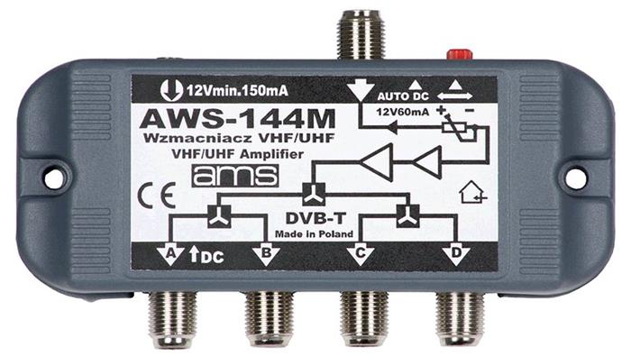 Širokopásmový zesilovač AWS-142SE s jedním vstupem (47 - 790 MHz) a dvěma výstupy pro domácí TV instalace. Zesílení 17 dB. Nastavitelné zesílení v rozsahu 14 dB. Zakončení na F konektory. Součástí balení je i napájecí zdroj. Zesilovač je vybaven automatic