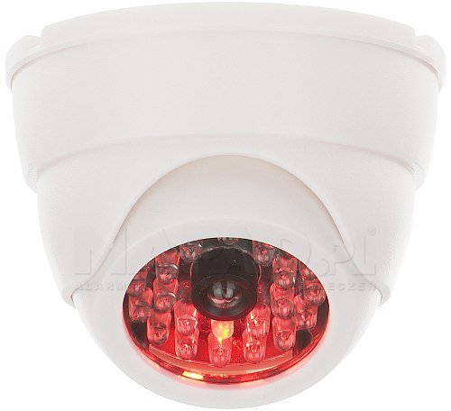 Atrapa kamery dome je praktické zařízení, které svým vzhledem připomíná kulové kamery s infračerveným osvětlením IR. Má blikající červenou LED diodu. Díky tomuto řešení atrapa přitahuje pozornost a je snadno viditelná. Atrapa je napájena interními bateriemi. Produkt je přizpůsoben pro instalaci uvnitř budov.