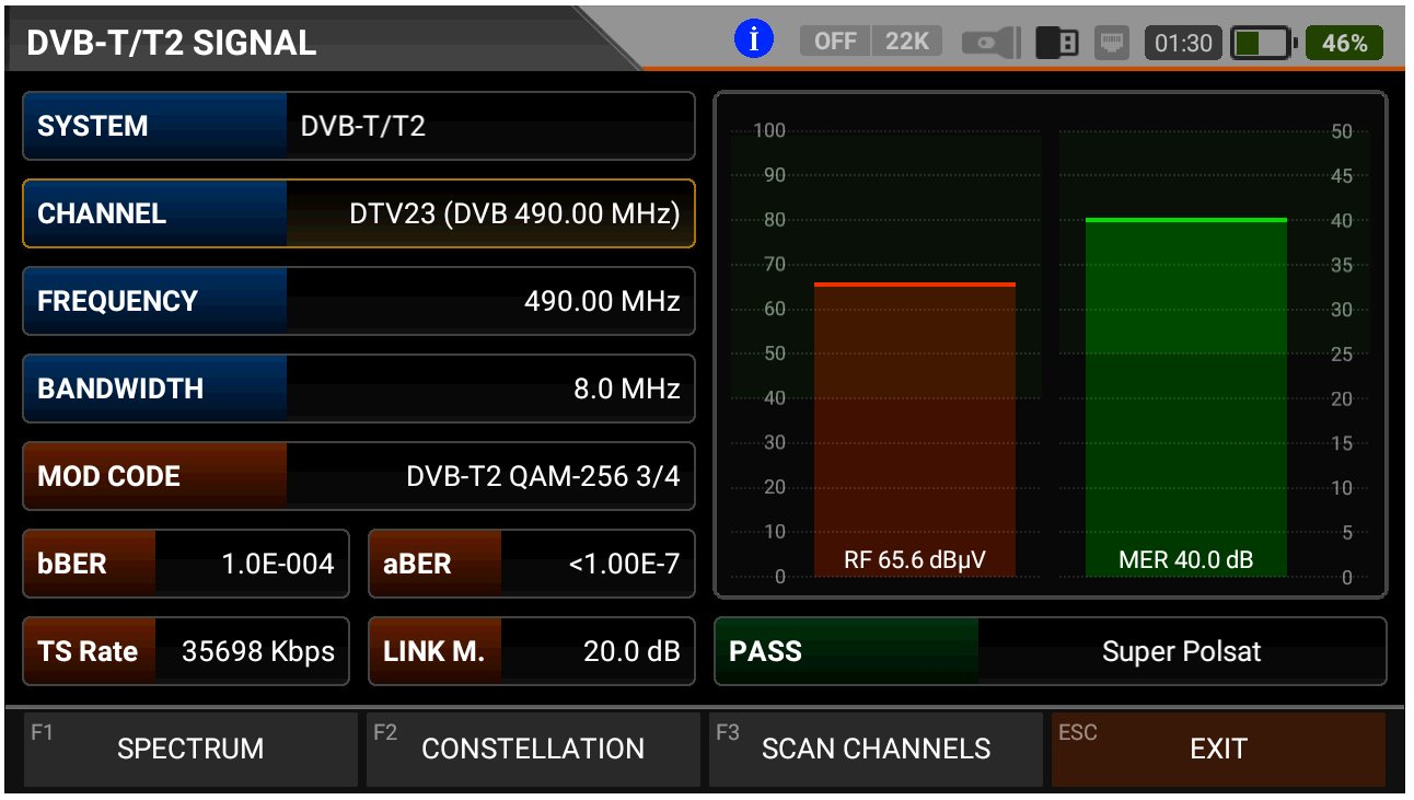 měření všech potřebných parametrů signálu, jako např: úroveň signálu vyjádřená v dBµV, MER, Link Margin, CBER, VBER