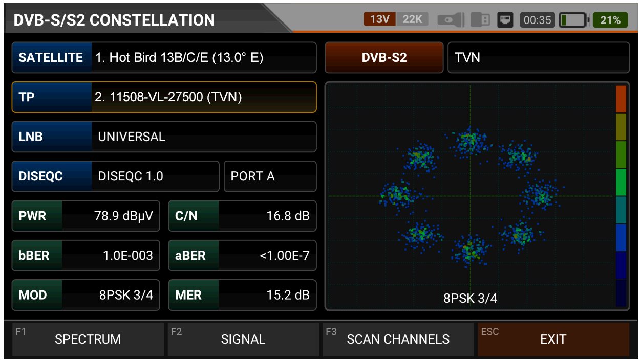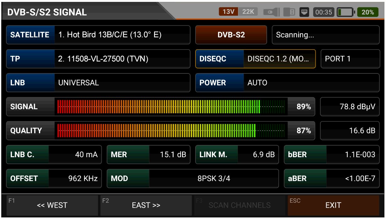 měření signálu DVB-S/S2 současně ze dvou satelitních pozic pro každý z 8 polarizačních/pásmových párů