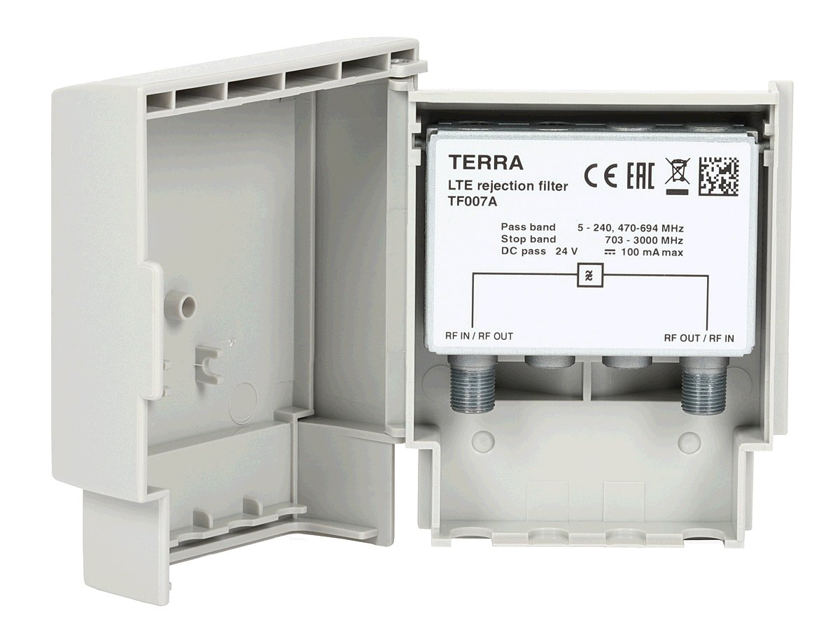 Terra TF001 je pásmový filtr určený k potlačení LTE700 pásma. Filtr je umistěn v Zamak odlitku s F konektory. Filtr je určen pro montáž do venkovního prostředí. <