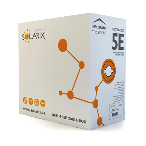 Venkovní kabel Solarix bez problémů splňuje a rovněž převyšuje požadavky definované v mezinárodních standardech TIA/EIA 568, EN 50173 a ISO 11801 pro CAT5E. Je tedy vhodný i pro provoz těch nejnáročnějších protokolů určených pro strukturovanou kabeláž (např. Gigabit Ethernet). Plášť venkovního kabelu Solarix má černou barvu, jeho teplotní odolnost se pohybuje v rozmezí od -20 do 70°C. Dodávané balení je 305 m v kartónovém boxu. Kabely jsou označeny metráží po 1 m.