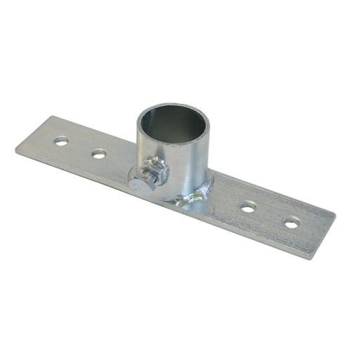 Výroba na zakázku cca do 20 dnů Patka pro upevnění stožáru o průměru 48mm s jedním zajišťovacím šroubem a delším pásem (240x50mm) se čtyřmi otvory o průměru 11mm pro šrouby ke kotvení do podlahy. Povrchově upraveno žárovým zinkem.