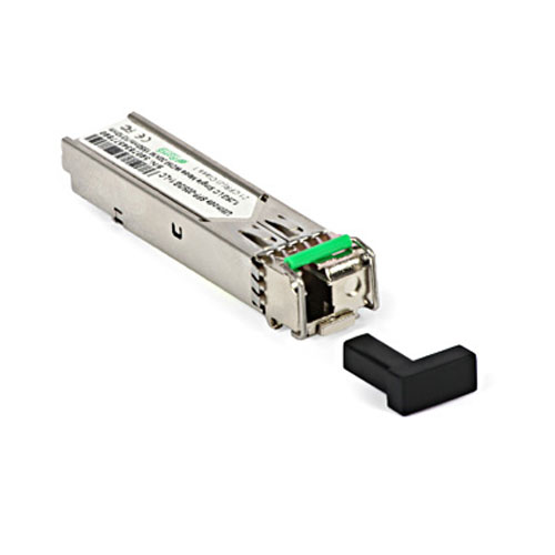 This ULTIMODE SFP optical module cooperates with a single-mode optical cable terminated with LC connector. LC connectors are characterized by snap-lock coupling and rectangular shape allowing close packing on the panels of various devices.