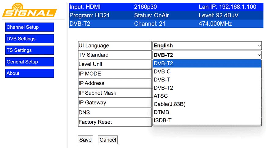 Standard na RF výstupu DVB-T2, DVB-T, DVB-C, Kabel (J.83B), ATSC, DTMB, ISDB-T