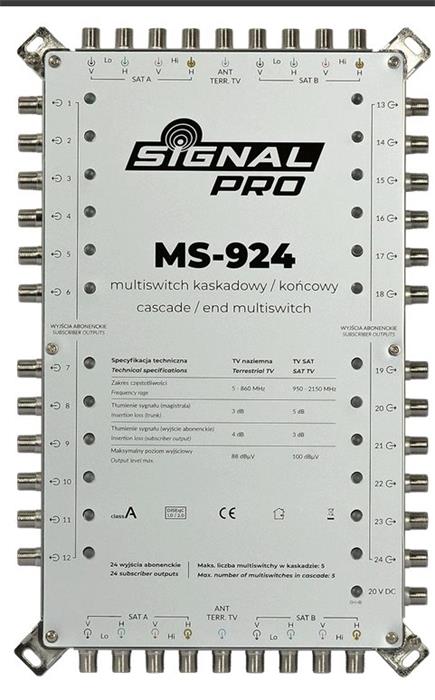 Multiswitch MS-932 SIGNAL PRO 9/32 je určen pro hromadné instalace RTV-SAT. • 9 vstupů (8×SAT, 1×TERR) • 32 nezávislých výstupů pro účastníky • Průchozí konstrukce (možnost kaskádování) • Velmi dobré impedanční přizpůsobení (IRL > 21 dB) • Lité pouzd