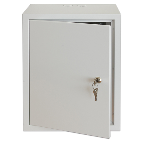 Montážní ochranná skříň uzamykatelná s montážní plotnou pro TV, SAT nebo WIFI prvky.Skříň je vyrobena z pozinkovaného materiálu proti zrezivění s povrchovou úpravou bílé barvy.Po odstranění krytek získáme otvory pro kabeláž na horní a spodní straně.