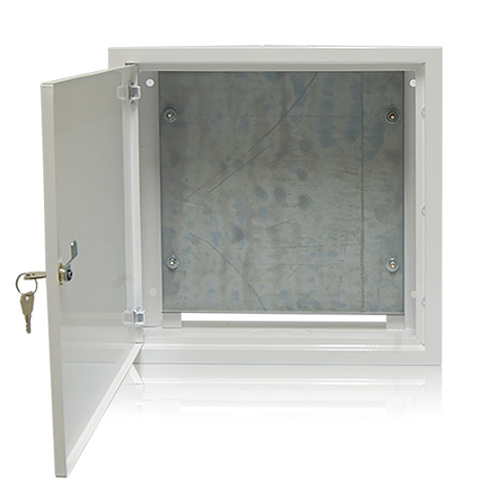 Montážní ochranná skříň uzamykatelná s montážní plotnou pro TV, SAT nebo WIFI prvky.Skříň je vyrobena z pozinkovaného materiálu proti zrezivění s povrchovou úpravou bílé barvy.Po odstranění krytek získáme otvory pro kabeláž na horní a spodní straně.