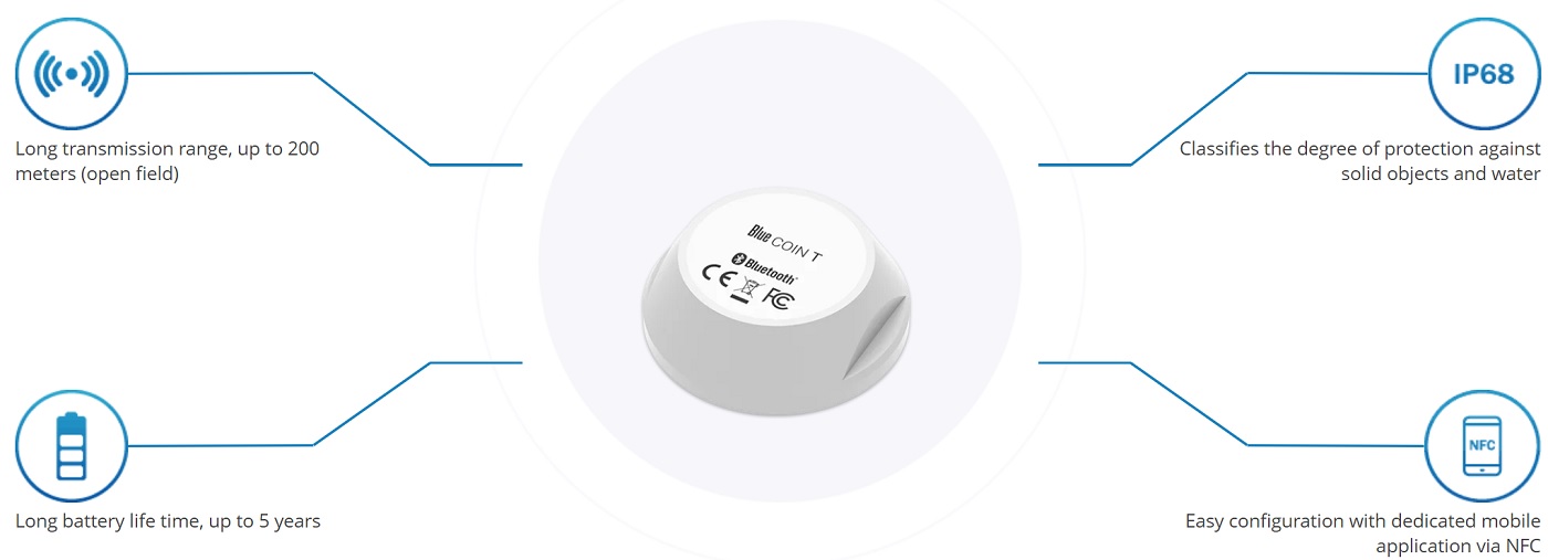 BLUE COIN T je teplotní senzor, který komunikuje přes technologii Bluetooth 4.0/4.2. s paralelní podporou NFC (slouží ke konfiguraci). Dosah čidla je až 200m v otevřeném prostoru.