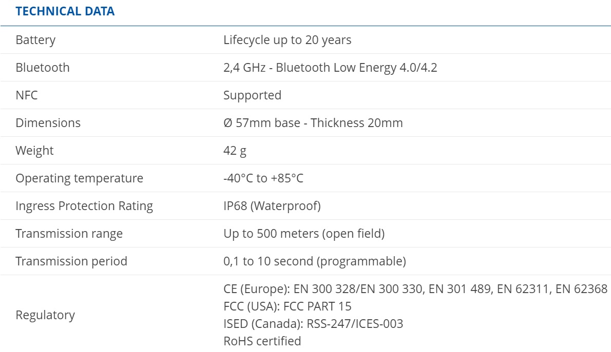 BLUE PUCK ID je po senzor pro identifikaci zařízení, který komunikuje přes technologii Bluetooth 4.0/4.2. s paralelní podporou NFC (slouží ke konfiguraci). Dosah čidla je až 500m v otevřeném prostoru.