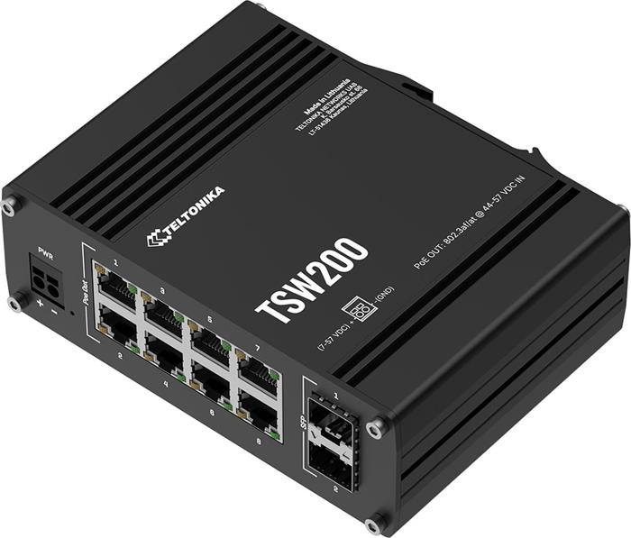 TSW200 je průmyslový PoE switch od Teltonika Networks s hliníkovým tělem, pasivním chlazením, bez managementu a switch je možné nainstalovat i na DIN lištu díky integrovanému držáku. Zařízení nabízí 2 SFP porty s Gigabitovou rychlostí, 8 LAN portů s rychlostí 10/100/1000 Mbps, podporou 802.3af/at PoE (30W/port) na všech osmi portech a celkovým PoE budgetem 240W. Napájení je řešeno 2-pinovou svorkovnicí se vstupním napětím 7 až 57V.