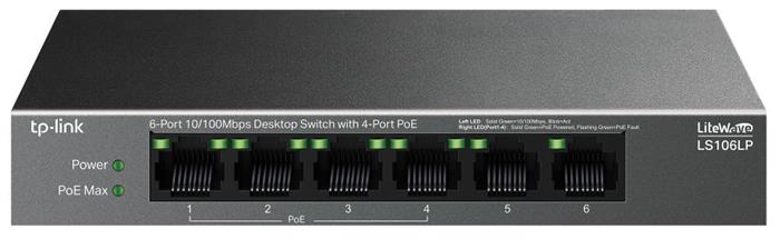 TP-Link PoE Switch LS106LP je nemanagovatelný PoE Switch s 6x 10/100Mbps LAN porty z čehož na 4 portech podporuje PoE 802.3af / 802.3at (od HW revize 2.0) až 15,4W/port. Celkový PoE budget switche je 41W. Switch umožňuje i PoE na vzdálenost 250m při přepnutí speciálního přepínače, který způsobí ponížení linkové rychlosti na PoE portech na 10Mbps, což pro přenos obrazu z kamer bohatě stačí. Další funkcí je PoE auto recovery, která automaticky restartuje nereagující zařízení napájená pomocí PoE.