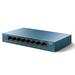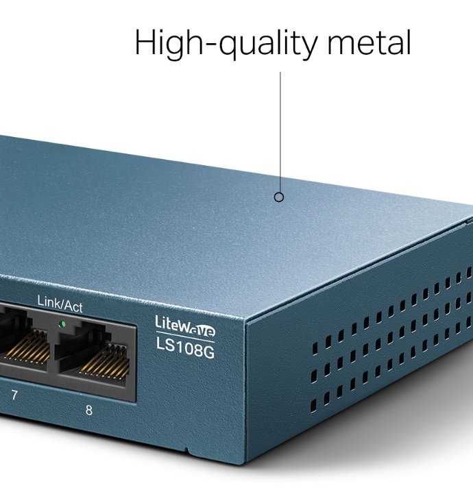 LS108G značky TP-Link řady LiteWave je elegantní nemanagovatelný domácí switch s kovovým šasi modré barvy, který disponuje 8x Gigabit LAN, napájením přes DC konektor na zadní straně, nízkou spotřebou a podporou Jumbo frames.