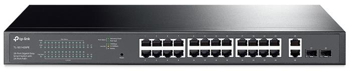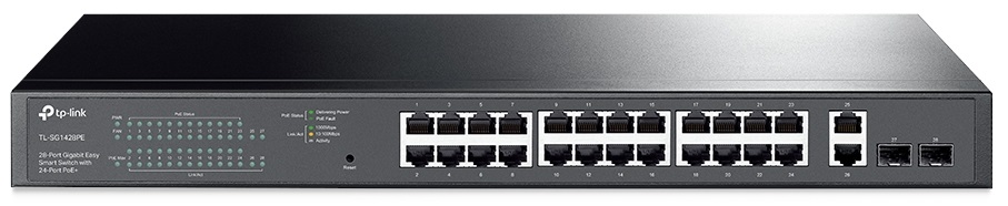 TL-SG1428PE je managovatelný Easy Smart rackmount PoE switch značky TP-Link s 26 Gigabit LAN porty a dvěma plnohodnotnými SFP porty. Prvních 24 portů podporují 802.3af/at PoE s maximální spotřebou 30W/port a celkovým PoE budgetem 250W. Další 2 porty jsou Gigabitové, sloužící jako uplink nebo pro připojení dalších zařízení.