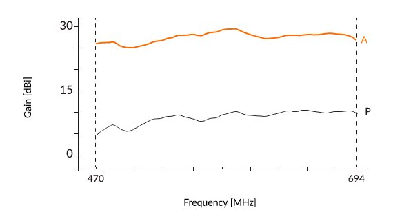 aktivní - režim aktivovaný napětím 12 V DC (je třeba použít napájecí adaptér - není součástí dodávky). Tento režim způsobuje dodatečné zesílení signálu přibližně o 20 dBi.