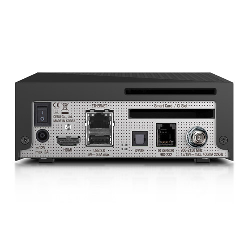 Umí přijímat satelitní vysílání v ULTRA HD 4K rozlišení(3840 x 2160) s podporu kodeku H.265 HEVC a také je vybavený CI/CI+ slotem pro dekódovací modul.