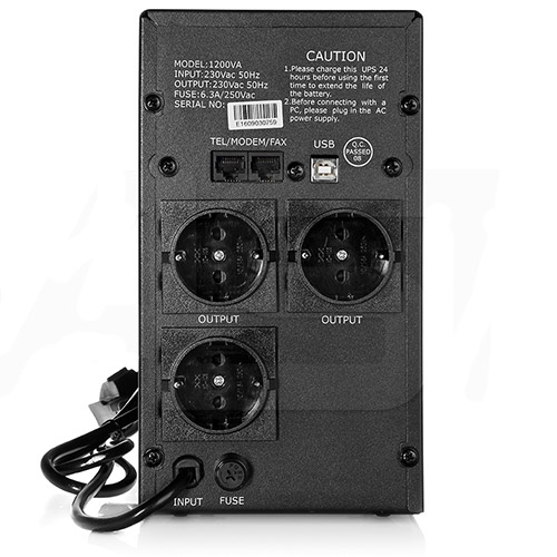 Záložný napájecí zdroj UPS120-LED je typem síťového interaktivního napájení s účinným výkonem 720W a zdánlivým výkonem 1200VA. Jeho vstupní a výstupní napětí je 230V. UPS 1200LED je vybaven 3 zásuvky a 2 bezúdržbovými gelovými akumulátory s kapacitou 7Ah/12V, jejich výměna je snadná, rychlá a můžete to udělat sami.