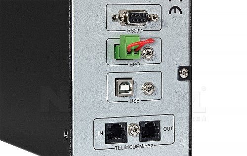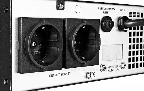 V zadní části UPS jsou 2 zásuvky, port USB a RS232. USB rozhraní umožňuje komunikaci mezi PC a UPS. Díky tomuto řešení může uživatel konfigurovat UPS podle svých potřeb. Vstupní a výstupní napětí je 230V.