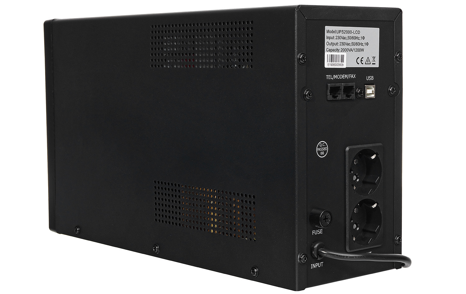 Záložný napájecí zdroj UPS2000-LCD je typem síťového interaktivního napájení s účinným výkonem 1200W a zdánlivým výkonem 2000VA. Jeho vstupní a výstupní napětí je 230V. UPS 2000LCD je vybaven 2 zásuvky a 2 bezúdržbové gelové akumulátory s kapacitou 9Ah/12V, jejich výměna je snadná, rychlá a můžete to udělat sami.