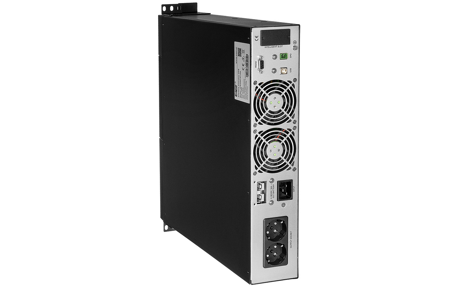 V zadní části UPS jsou 2 zásuvky, porty USB, RS232, EPO, konektor RJ45 . USB nebo RS232 rozhraní umožňuje komunikaci mezi PC a UPS. Díky tomuto řešení může uživatel konfigurovat UPS podle svých potřeb. Třetí z těchto portů EPO, umožňuje vzdálenou deaktivaci UPS. Konektory RJ45 jsou chráněny před přepětím. Vstupní a výstupní napětí je 230V.